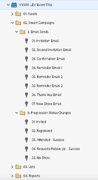 As part of your MPT, I recommend building out folders to organize the different elements of your program. Each folder should contain appropriate assets (emails and landing pages), smart campaigns, reports, etc. Within these program templates, you should include the smart campaigns used to send emails and change program status, so the process remains consistent. Remember to adapt your standardized naming conventions for your MPTs so they can be easily updated when cloning them to create a new program.