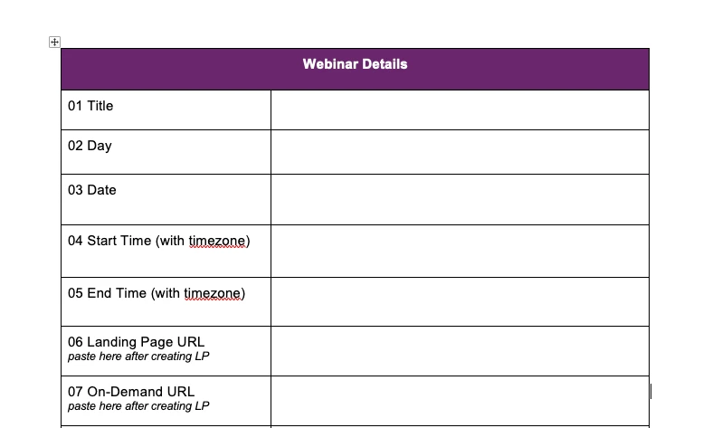 One of the keys to an effective Center of Excellence is to have a single location where all the key information for your Program is documented. We call this a “Creative Brief” at my current company, and we just clone a Google Doc template. You may use a spreadsheet, a form, or even a ticketing system. The result should be one place that is the “source of truth” for the Program. For example, it would contain the webinar title, day, date, speaker names, speaker titles, landing page URL, etc.