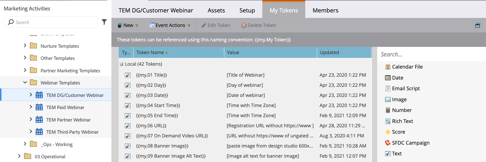 Marketo Engage’s program templates and tokens are the backbone of a scalable marketing operations Center of Excellence. A robust template library will help you quickly and accurately implement webinars, gated content, events, and more. The more you can tokenize your program templates, the less time that you have to spend editing individual emails and landing pages.