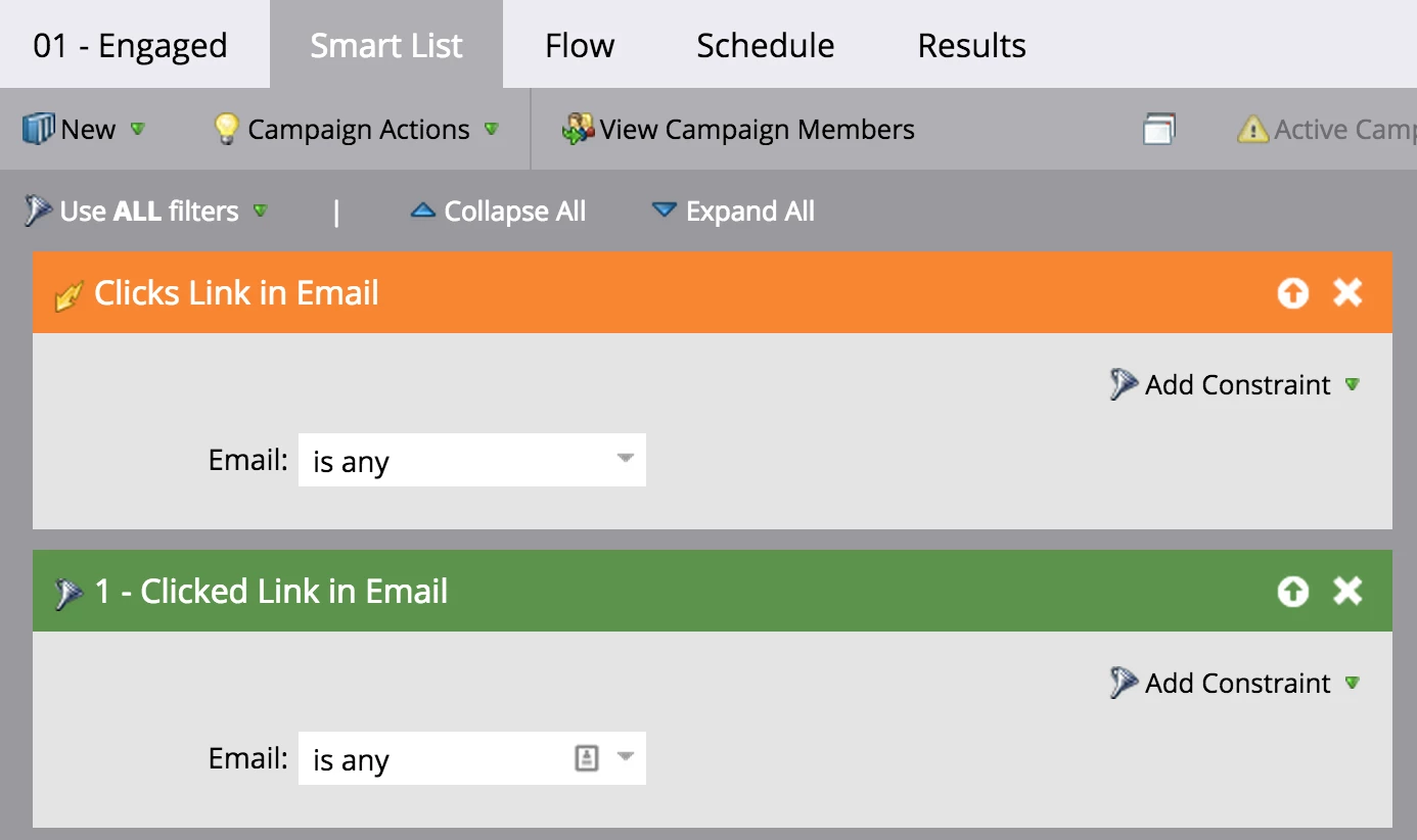 3. I want to change program status to Engaged if they click on any link in an email - will the below smart list in the engagemeng program only count clicks in emails WITHIN the engagement program, or across the entire system (which I don't want)?