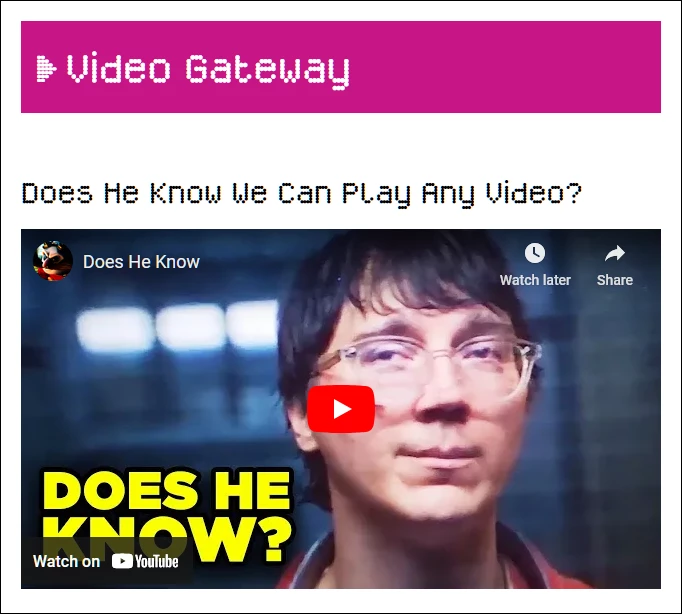 [3] Far as I know, there’s also no way to stop the YouTube site itself from playing a video, given the ID. Even trying to embed a specific @channel in the youtube.com URL doesn’t help: if the ID is found, it switches to that @channel.