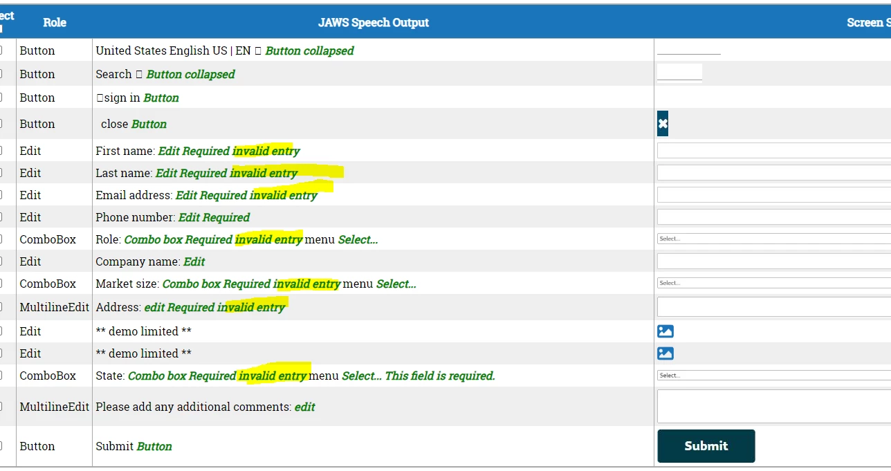 "When we check for the screen reader text, all the highlighted text below would get read out. They are the error messages for the form fields and this would be confusing for the end user. They are usually meant to be hidden until form validation occurs on submit. I believe this will impact all the new Marketo forms. Can you aresolve this issue if possible?"