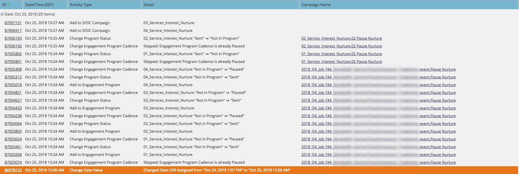 Each person in List 1 was added to every nurture program and then their status was set to pause.