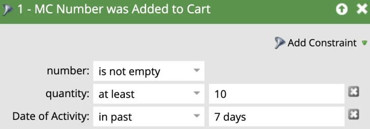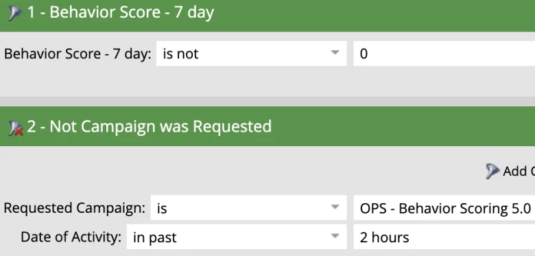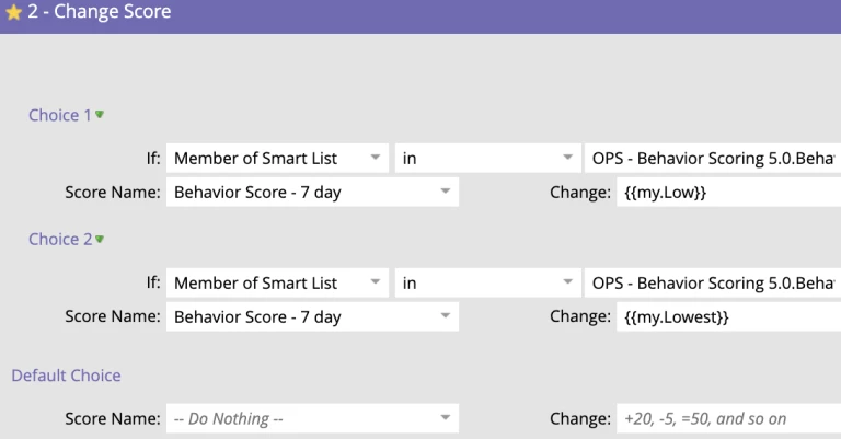 The first step in the campaign at the top of the waterfall is to reset the “Behavior Score – 7 day” field to 0 since we will be recalculating this value and adding on points in subsequent flow steps for each activity they have done. Then each scoring campaign consists of “Change Score” and “Change Data Value” combinations.