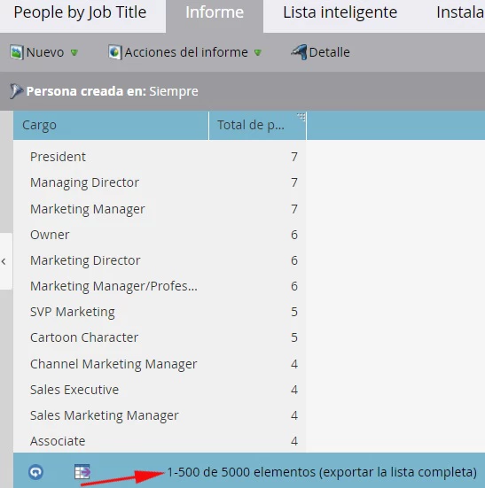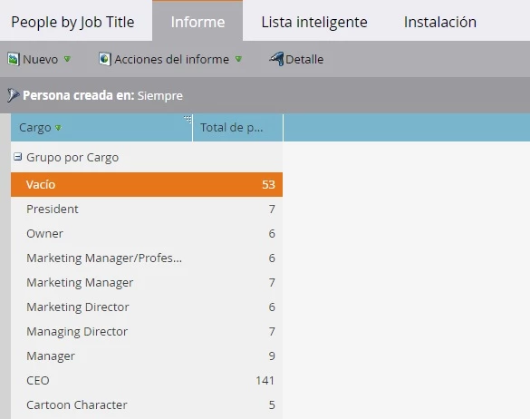 Para la segmentación de “Cargo” basada en “Cargo”, el informe “Personas por cargo” ayudará a descubrir qué valores únicos debemos considerar para la lógica y la prioridad de la segmentación. Aquí puede ver unos 5000 valores diferentes posibles que deben tenerse en cuenta.