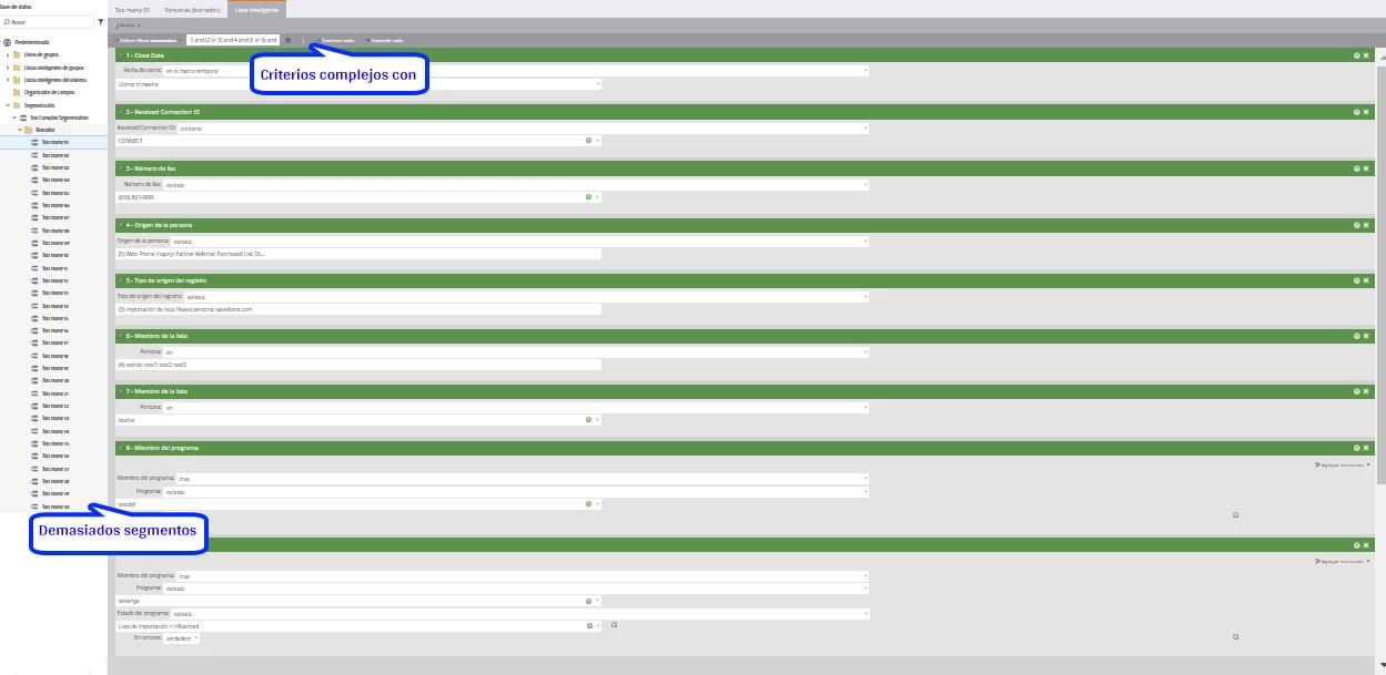 - Criterios de segmento demasiado complejos con muchos operadores “contiene” y muchas restricciones.
