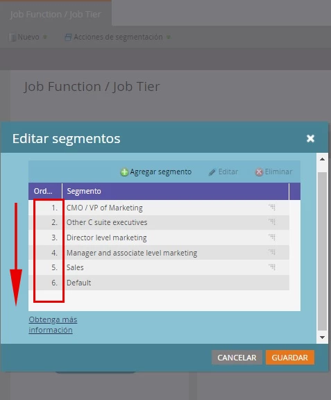 Deberá modificar el orden de prioridad de segmentación de manera adecuada para colocar un cliente potencial en el segmento correcto según las prioridades de orientación de su negocio, como se muestra a continuación: