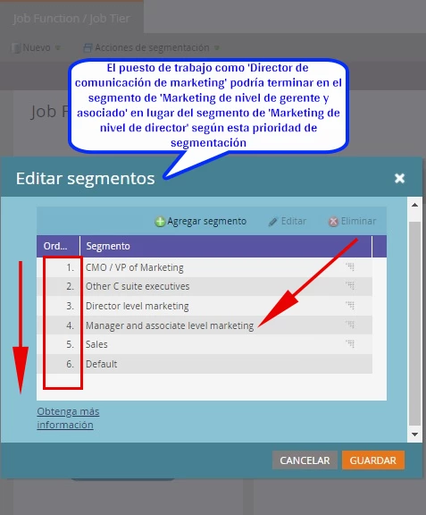 De esa manera, “Director de comunicaciones de marketing” se ubicará en el segmento “Marketing de nivel de director”, mientras que “Especialista de marketing”, etc. seguirá cayendo en el segmento “Marketing de nivel de administrador y asociado”.