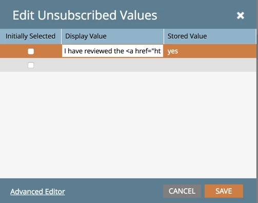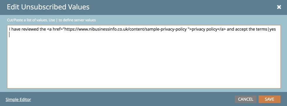 The hyperlink can either open our privacy policy page in a new tab or display our privacy policy in the form of a lightbox.