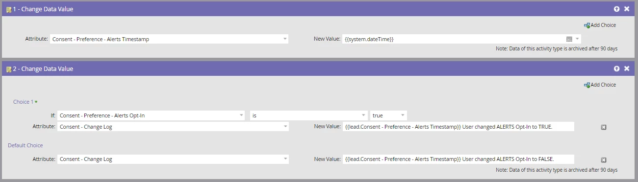 I've already created the preference opt-ins and the timestamps - these are all pretty much working as I'd like. But in the trigger campaign that writes the [timestamp + preference change] to the change log, the timestamp gets changed, even though the timestamp field itself is correctly populated.