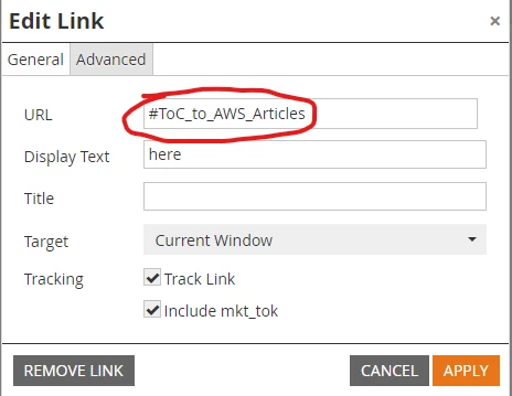 This is the most important step that took me way too long to figure out. When you're on the Insert/Edit Link field, you will add the anchor to the "URL" box. But when you add it in to that box, type it in with the "#" before the name of the anchor. That is how the system fully connects the link to the anchor within the email. So in this case, I wrote it in as "#ToC_to_AWS_Articles".