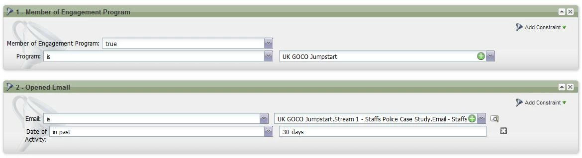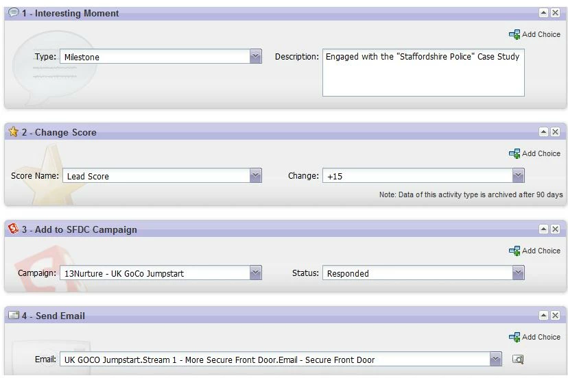 4. Trigger Campaign: listens for CTA miss (NOT WAS CLICKED) and then pushes that lead into Email 2 or 3. (Remove from Flow, Call Campaign).