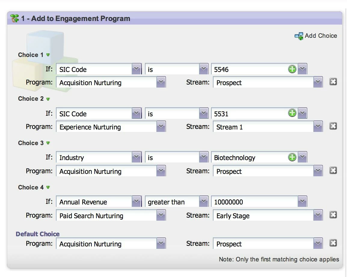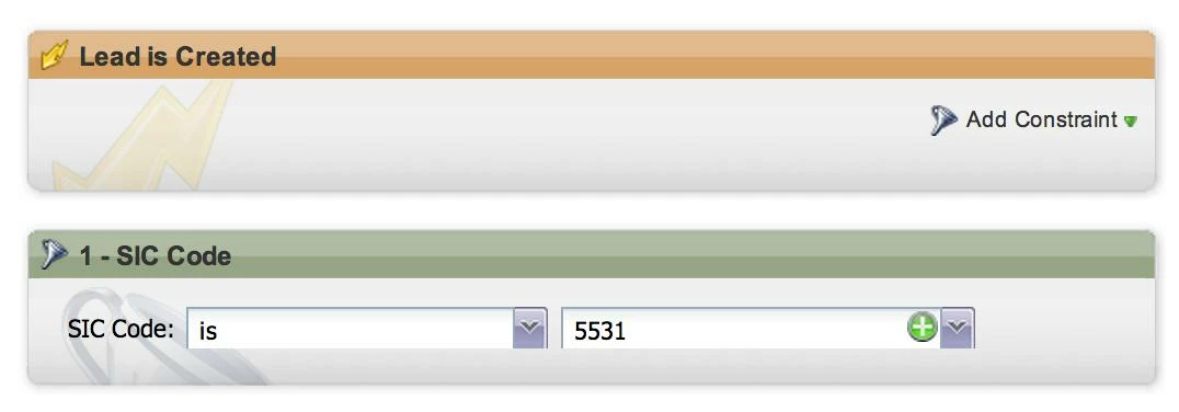 New lead is added to SFDC with the SIC Code 5531. We would trigger adding them to our nurture campaign for that specific target vertical.