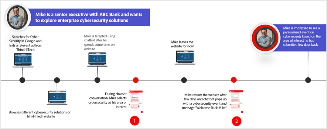 After few days, when Mike returns to ThinkHiTech website, he is delighted to see chatbot with a personalized and contextual upcoming event message based on his area of interest.