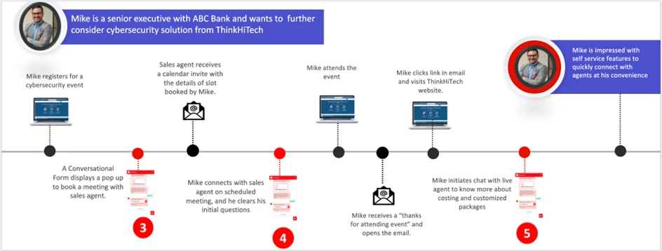Mike is actively considering ThinkHiTech for cybersecurity products for his company ABC Bank. He wanted to talk to an agent to further understand pricing and support services. Mike clicks link in email he receives from ThinkHiTech and is delighted to see a chatbot appear with an option to talk to a live agent.