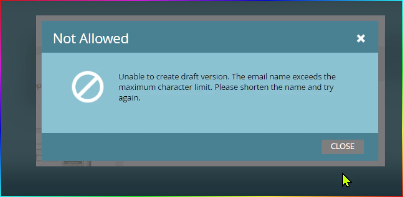 "Unable to create draft version. The email name exceeds the maximum character limit. Please shorten the name and try again."