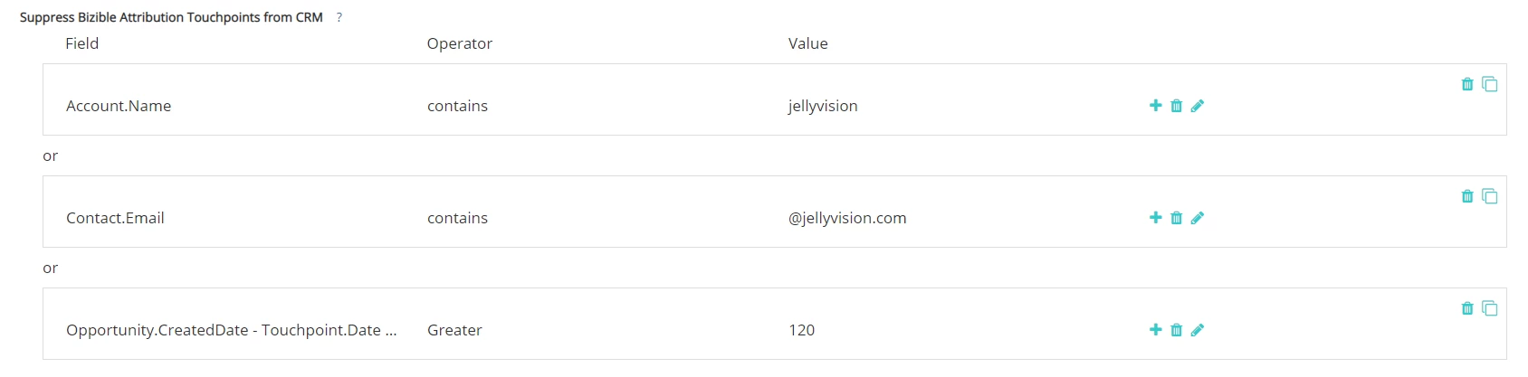With the Touchpoint Suppression capability within Bizible, you can determine the types of touchpoints you want to look at, and set windows for when you want to set attribution and give credit. For example, by using an integer field operator, you can see how many days a touchpoint occurred prior to the opportunity creation.