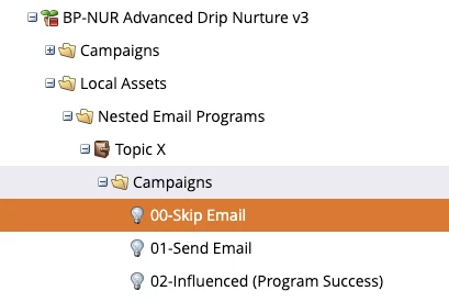 Inside each of the nested programs is a smart campaign called "00 - Skip Email", which I'm guessing is a way to prevent users who have already downloaded that content from receiving an email about said content and move them on to the next cast: