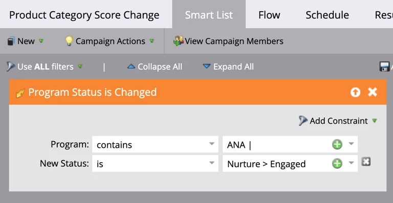 - The Smart lists will be “Program Status Changed > Program Name contains | CCA | > New Status is X” > Flow = Change Score > Score is CCA Score to X Token