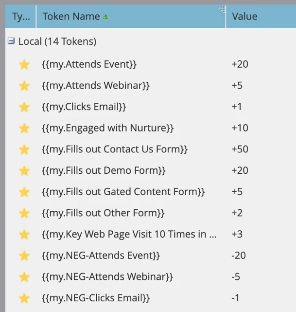 - Then build a scoring program per Company (i.e. 4 programs for this example). If the values are the same per activity (I.e. if a person fills out a form, it’s +5 across all Companies) create a folder to hold all programs and build your tokens there so they will be inherited across all programs. If they will vary by Company, you can build them in Program > My Tokens