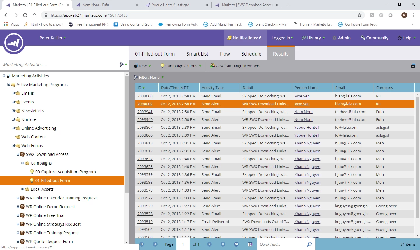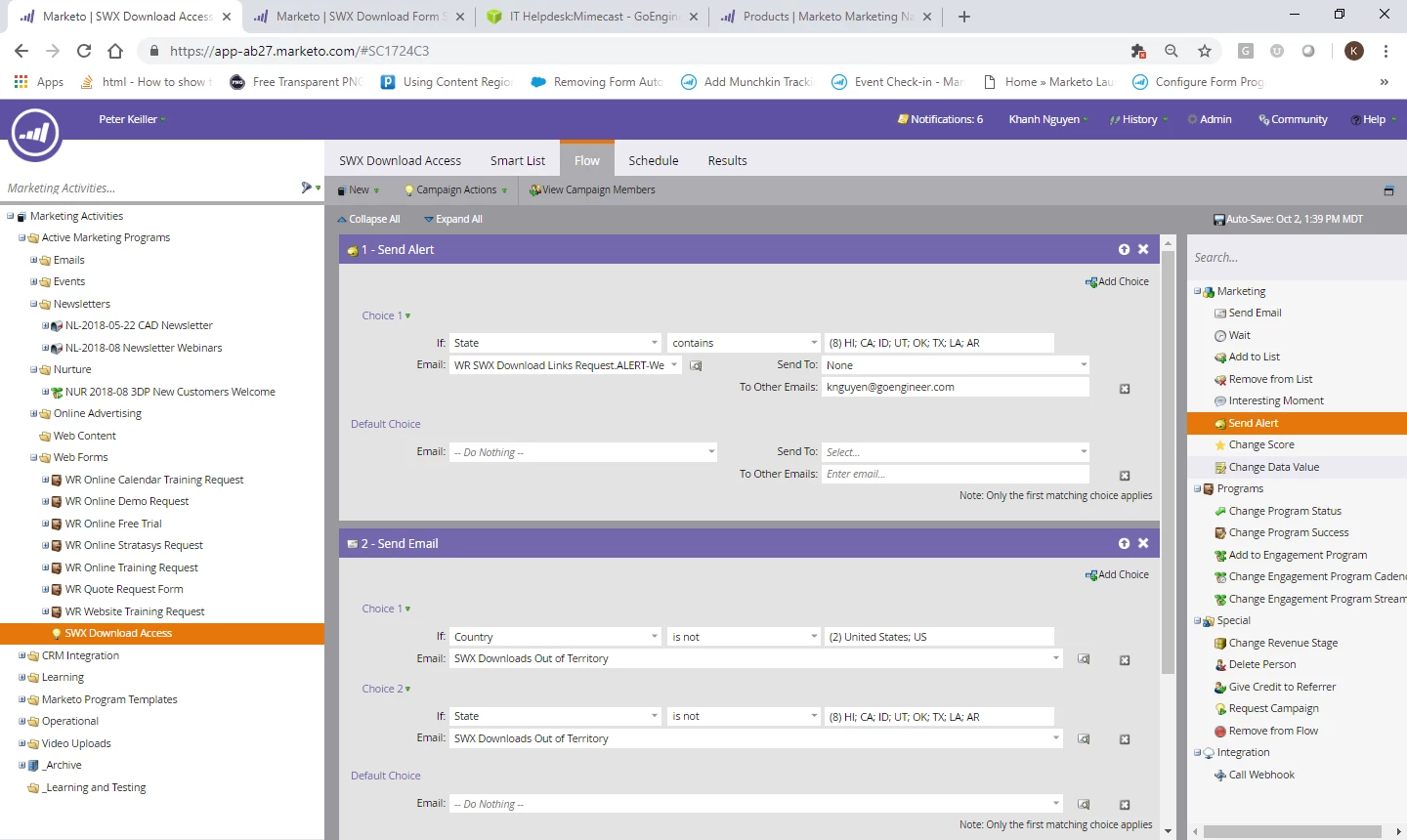 I'm new to Marketo so please forgive me if this is a stupid question. I can't seem to get the Send Alert with filters to work. Here's a screen shot of my Campaign: