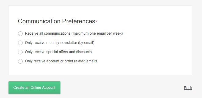 We use Magento 2 for our e-commerce site and when a customer sets up an online account we ask them to select their communication preferences as below.
