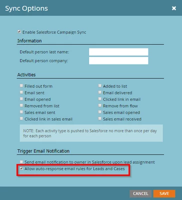 When both Allow auto-response email rules for Leads and Cases in Marketo and Web-to-Lead in Salesforce are enabled, any record that Marketo inserts into Salesforce will be sent the Default Response Template email selected in the Web-to-Lead Settings in Salesforce, regardless of how that record was initially created in Marketo (form fill, list import, API, etc).