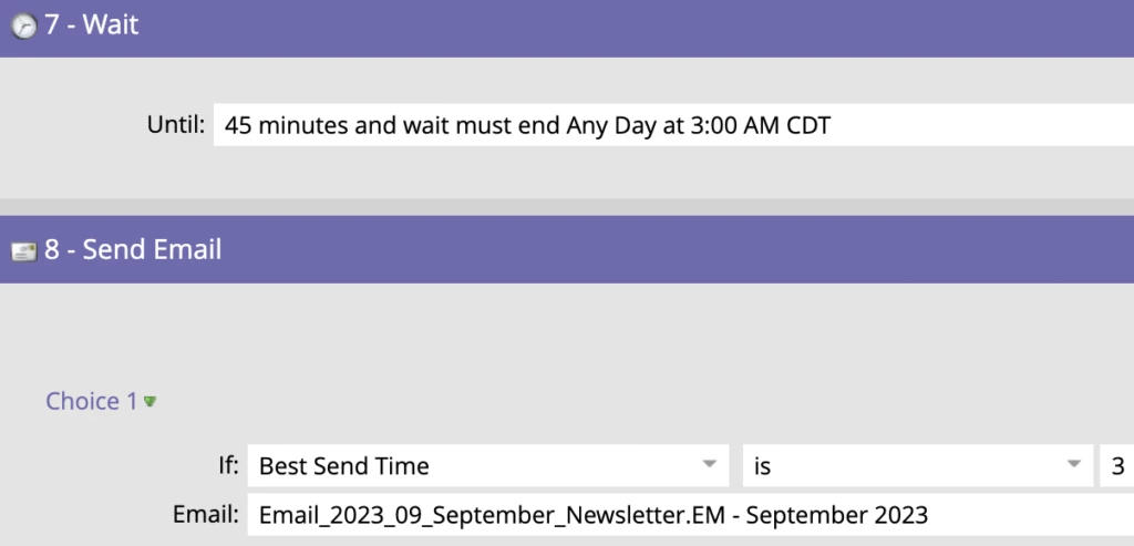 The smart campaign is scheduled to run at midnight on the day that we want the email to be sent. Therefore the very first action is to send the email to anyone whose best send time is "0". Then we wait for 45mins with the wait ending at 1am before sending the next email to anyone whose best send time is "1am". These actions are then repeated for each of the remaining hours in the 24-hour clock.