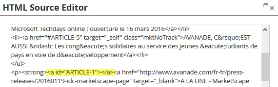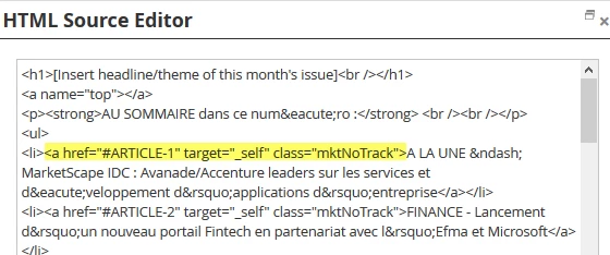 One of our marketers in France created a newsletter with anchor links at the top. Attached is the HTML. When viewing in a browser, everything works fine. But not when viewing in an email client (Outlook or Gmail). Each link is configured as not trackable. When looking at the source code in Outlook, the links are indeed not Marketo tracking links. Any thoughts?