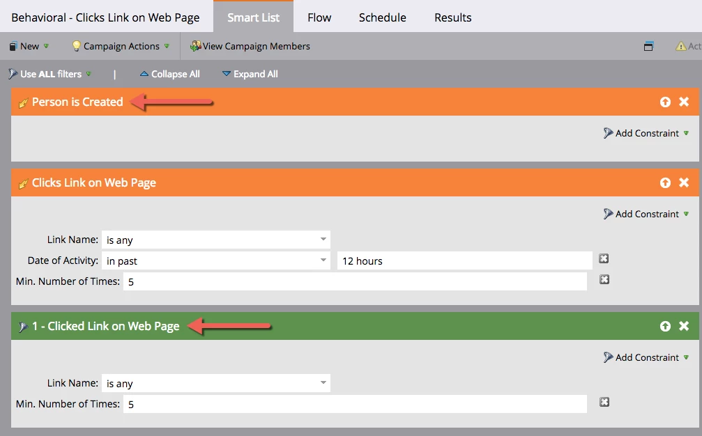 But those "replays" will only occur once you've been migrated to Munchkin v2. Until then, one of the workarounds is to include a "Lead/Person is Created" trigger and the appropriate filter (to match the original trigger). Here's an example where I added both the trigger and filter (originally, just the single "clicks link on web page" trigger was used):