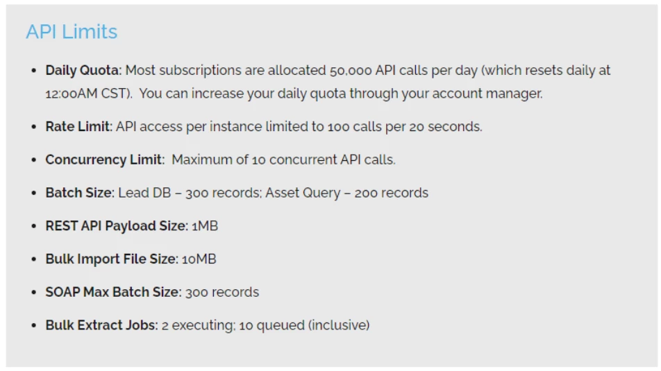 We are trying to the understand what the API limits are for the Marketo API in our company. Do you know where we can get to the information below?