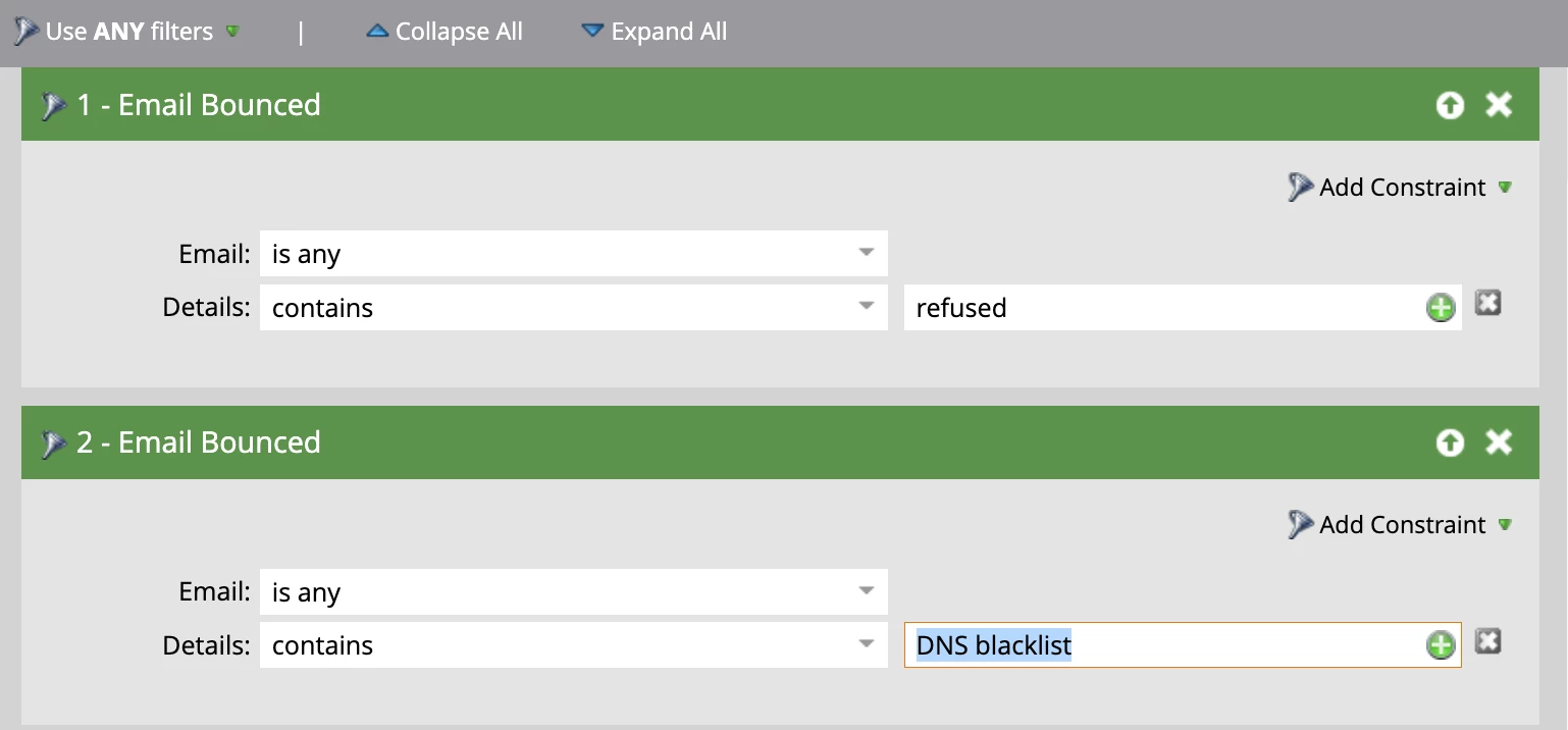 We’re looking for guidance on refining our smart list to identify emails blacklisted by companies due to their policies. Currently, we’ve included filters such as "Email Bounced" with details containing "refused" or "DNS blacklist." However, we want to ensure we capture all potentially blacklisted addresses.
