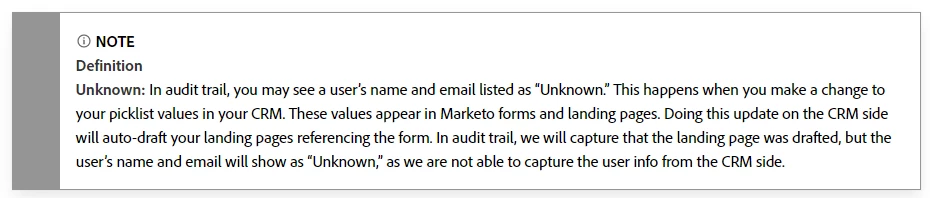 However, in the case where you have a picklist field on the form/landing page, and your CRM (let us take an example being Salesforce as the CRM) has added more picklist values to a field, this will propagate the changes to all the forms/landing pages that have this field. Therefore, the Audit trail will identify that a change has been made to the form/landing page, but because the CRM is not an actual user, the Audit trail will show them as Unknown.