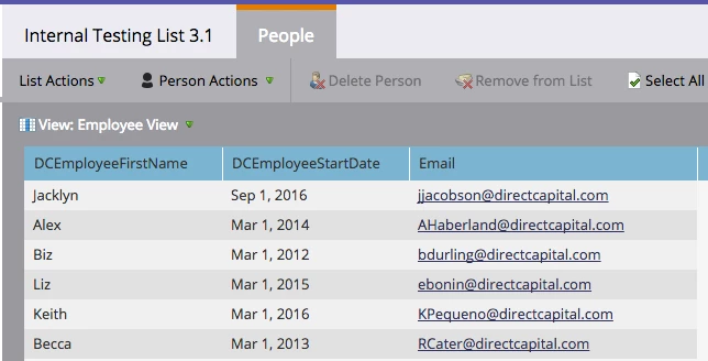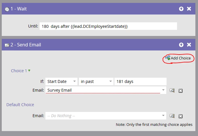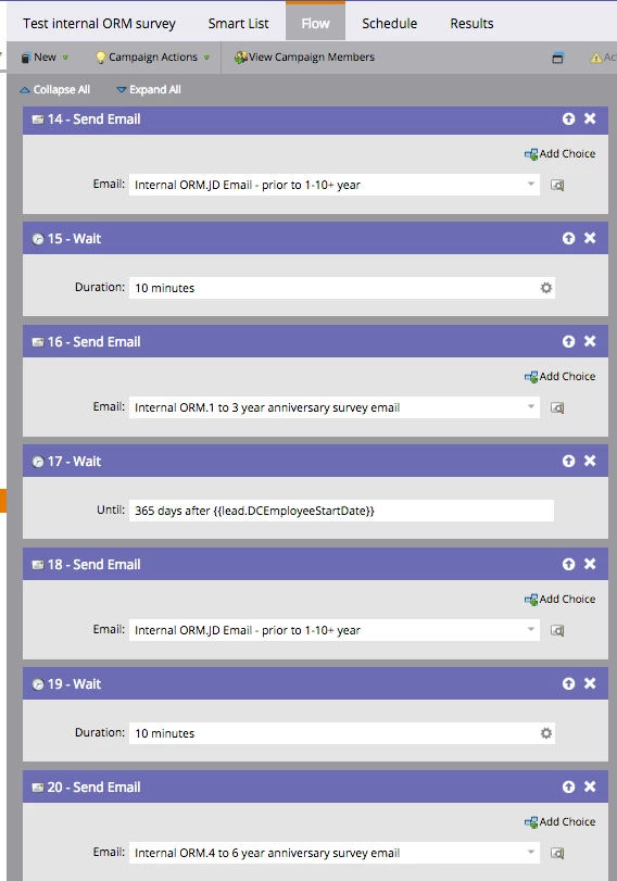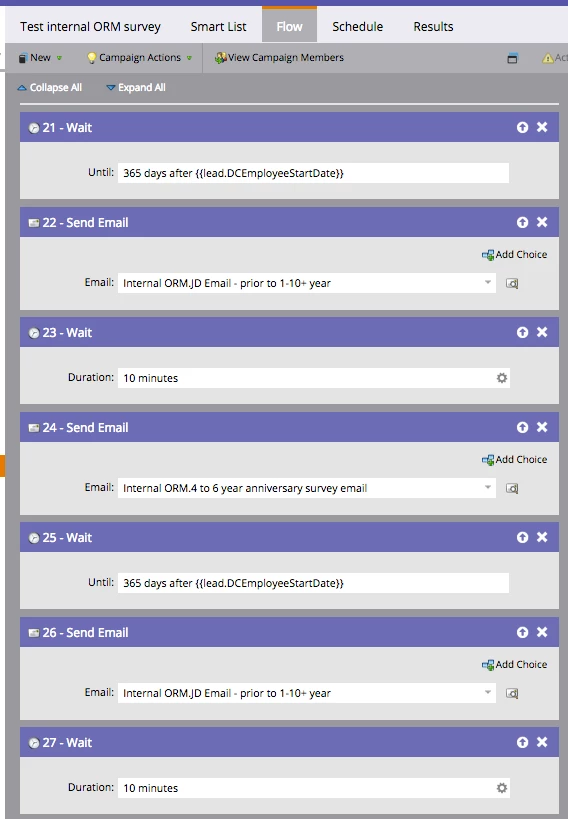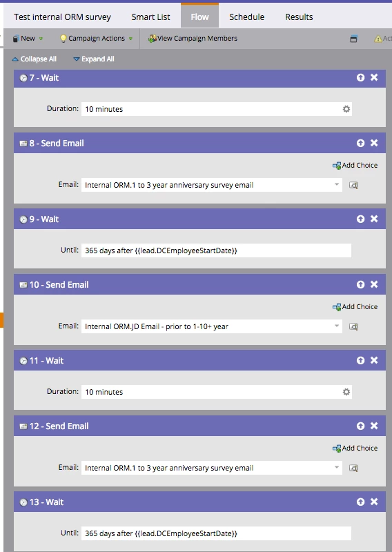 Goal of my email campaign is to email internal employees a survey at the following anniversaries: