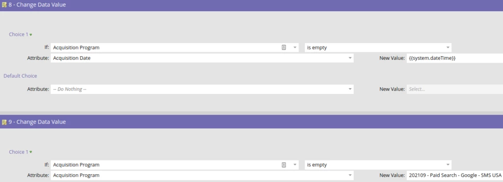5. If the person’s Acquisition Program is empty then set the Acquisition Program to the parent program of this smart campaign and the Acquisition Date to the {{system.dateTime}} token. Setting these 2 fields is the most important requirement for doing program performance and attribution reporting.