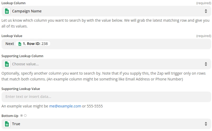 Once the Zap has been triggered, the next step is to take the row ID of this latest submission and use that to search for the row currently filled with “Next Row #” in the UTM Builder sheet.