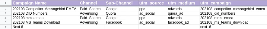 - Take the channel, sub-channel, and utm parameters for the ad campaign from Step 3 and use these to populate the