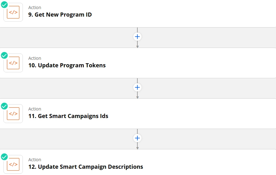 If Step 8 to clone the latest UTM program for a particular sub-channel is successful then the program ID of the newly created program will be returned. However, I often found that although Marketo was able to successfully create the new program it did not return the successful response and program ID to Zapier within the 10-sec timeout limit imposed on every Zapier action. Therefore, Step 8 would fail along with all the subsequent steps in the zap, which depend on the returned program ID.