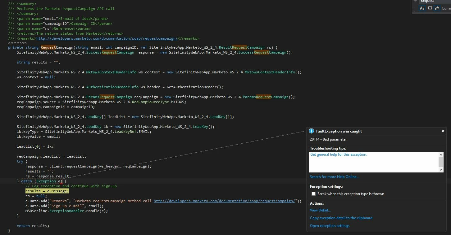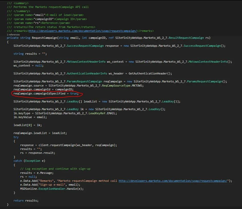 We're passing the leadKey (e-mail), source, and campaignId. I've stepped thru the code to verify these values are correct. Here's the code (C#):