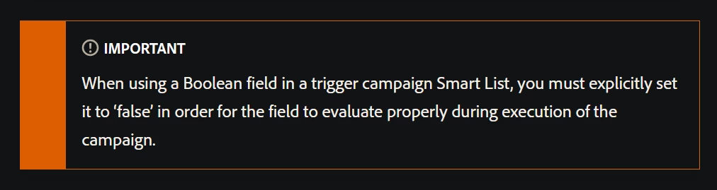 When using a Boolean field in a trigger campaign Smart List, you must explicitly set it to ‘false’ in order for the field to evaluate properly during execution of the campaign.