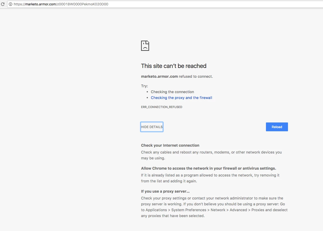 After we changed our Branding Domain in the admin panel to marketo.armor.com all of our email links broke. We simply get a site can't be reached error on any email links.