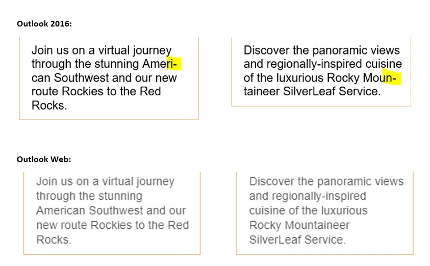 Looking for some help to eliminate wrapping and hyphenating words inside td's when rendering in Outlook 2016. It is not an issue on Gmail, Outlook Web, or Outlook Mobile; it's just the Outlook 2016 desktop app.