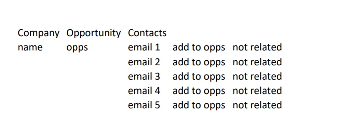 A table with "opportunity" + "company" + "associated contacts", that shows also a button for every associated contacts, to select – “add to opportunity”, “not related to opportunity”.