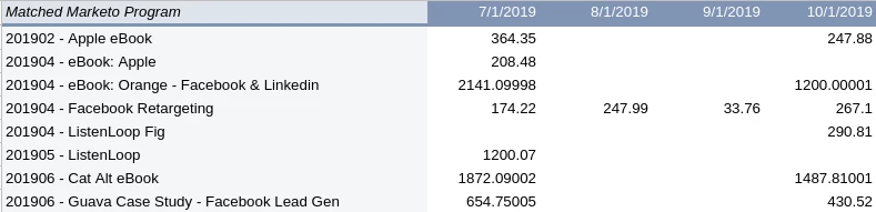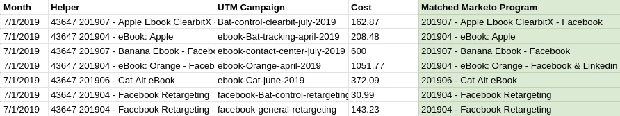 ELSE for all subsequent (date,cost) pairs date will be one of the date headers and if the cost for this header is not null and the program existed before this date or was created in the same month then append the (date,cost) pair to the costs list. If there was spend for a paid campaign in months before the corresponding program was set up e.g in June, then you do not want to add the program costs for these prior months because they will incorrectly drive up the cost per lead for the leads who became members of this program from June onwards. Once all the (date,cost) pairs have been collected a single API call will be made to upload them to the program.