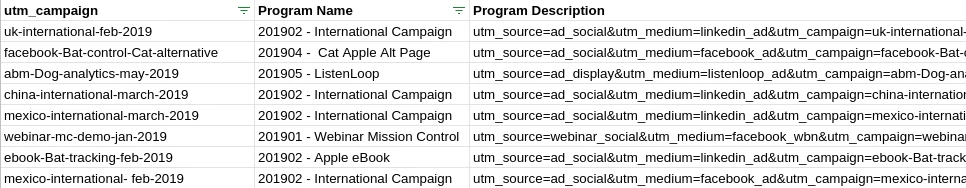 All our programs were set up so that the utm parameters the program is set up to track are included in the program description. Thus, once the program names and descriptions have been imported into the Campaign-Program Mapping tab, the utm campaign parameter can be split from the “Program Description” field.