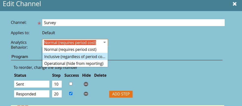 Every program has a “Period Cost” attribute, which allows you to input marketing costs (advertising, events, offers, etc) for each month the program is live and generating leads. Thus, with the number of leads generated by the program and how much it cost to generate these leads, a cost per lead can be calculated.