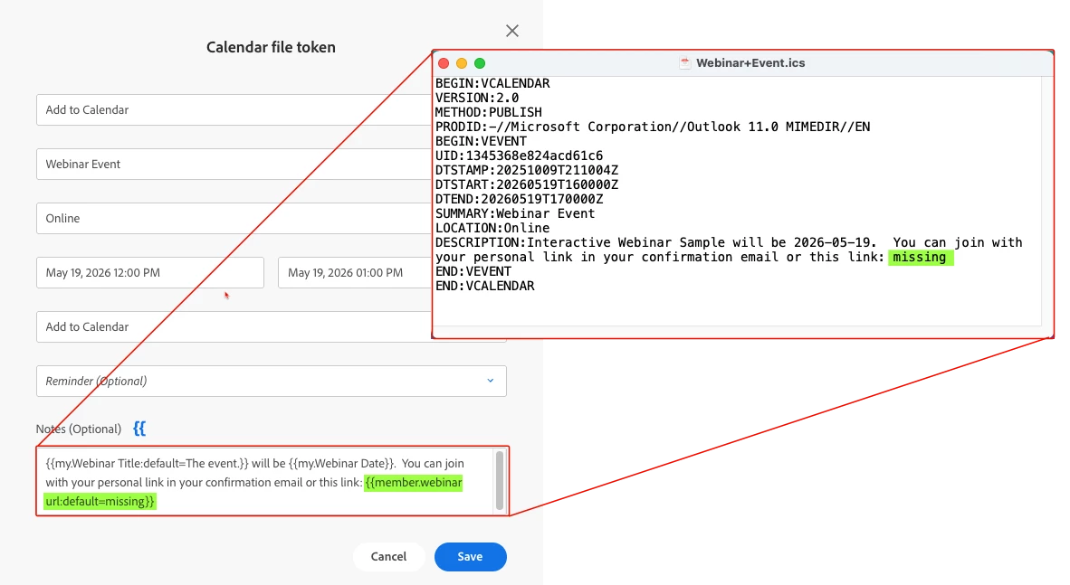 Let’s break it down. The Calendar File token is a handy way to let registrants add your webinar to their calendar. It can include other tokens, like the webinar join link, so recipients have everything they need in one click. But here’s the catch: that join link token only resolves when the email is sent via a triggered smart campaign. If you send it manually or through a batch campaign, the token doesn’t populate. The result? A calendar file with a blank join link. Not ideal.