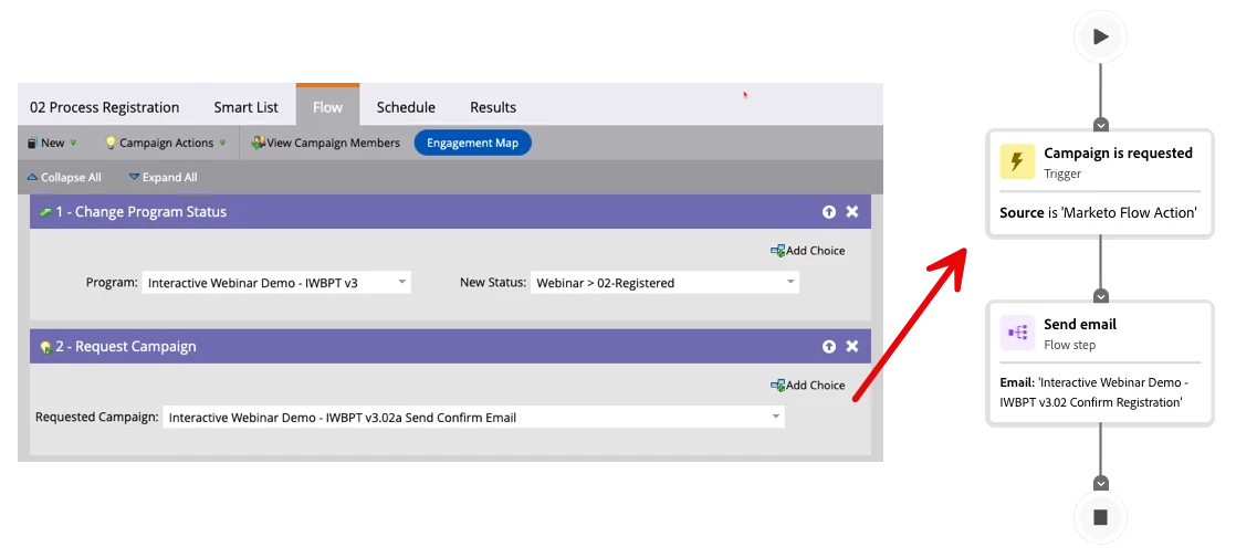 So how do we fix it? The answer lies in a simple program design tweak: create a smart campaign with a “Campaign is Requested” trigger. This campaign becomes your dedicated email sender. Instead of sending the email directly from your registration flow, you add a “Request Campaign” flow step that calls this triggered campaign. That’s it. The email now sends in a context where the token resolves properly.