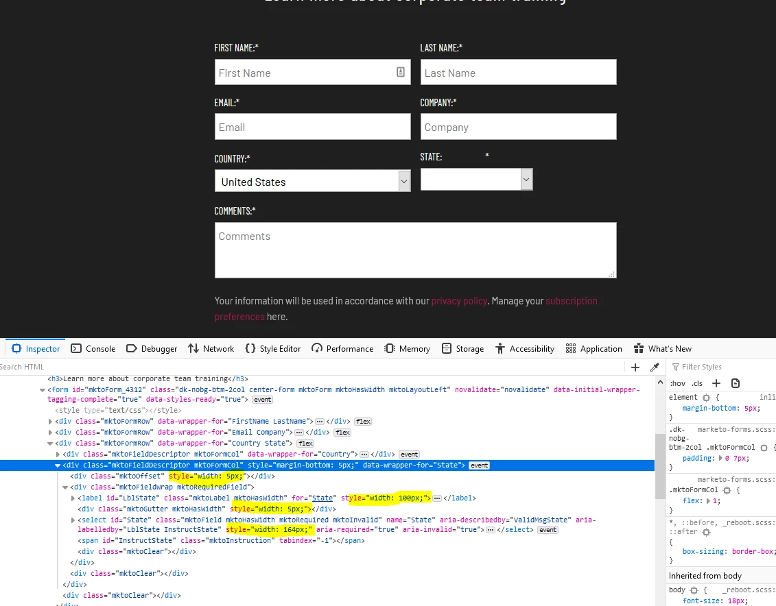 If there a function available to detect when say a new conditional select element or input has been added to a form? I am using the functions found here to strip all styles from the form but these dont apply to conditional elements added later. I also have some javascript on the form to add a class to the mktoFieldWrap of each element so i can target the labels by say label for checkbox vs label for input. These classes get added when form is ready, but not to the conditional conset checkboxes that appear after selecting values from select elements.