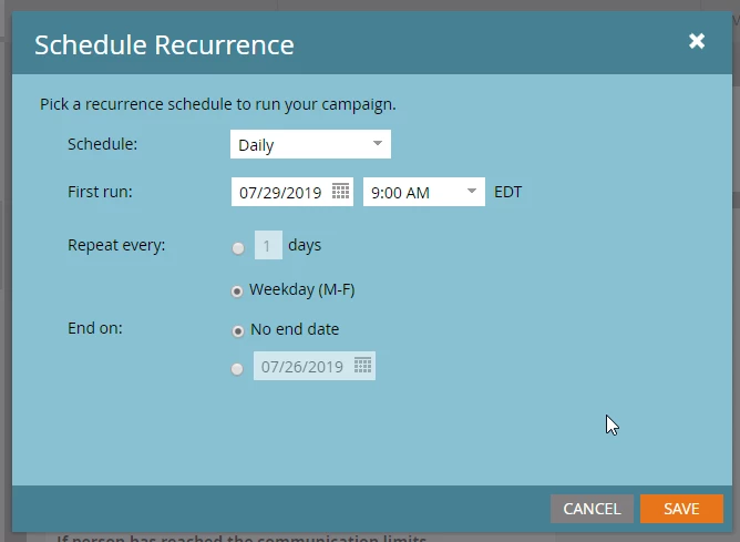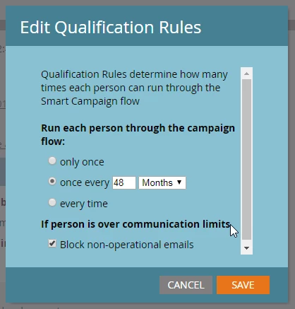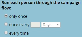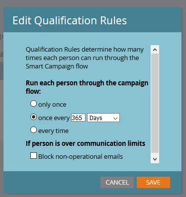 Then in your qualification rules, you want someone to qualify one time every year, so I set this to once every 365 days. Also, setup the recurrence to run your smart list once a day to check for anyone who qualifies.
